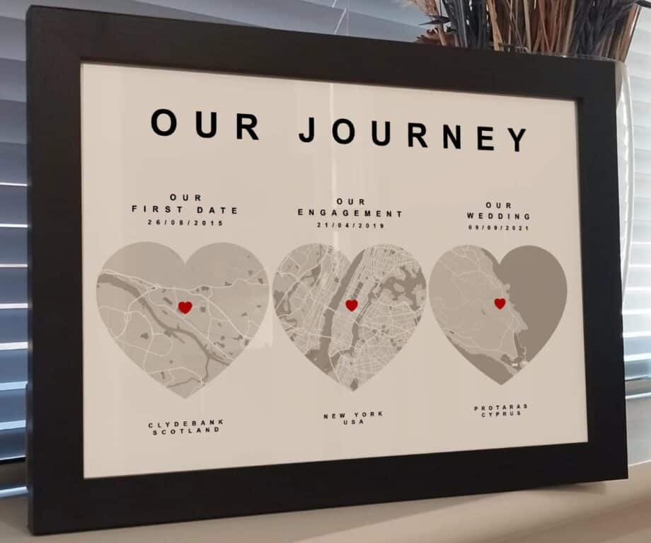 Treat your wife, husband or partner with a unique map journey wall art print, perfect for every occasion, including Valentine’s Day. A framed romantic journey map print that is the perfect cartophiles, available from Etsy.