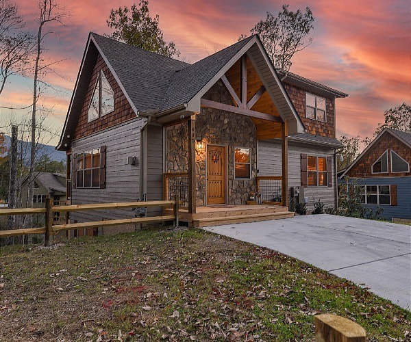 This pet-friendly modern cabin is a hit with extended families, multi-generational groups, and people traveling with kids. This cabin sleeps 18 people, comes with a spacious outdoor patio for grilling, and a game room with twelve bunk beds.