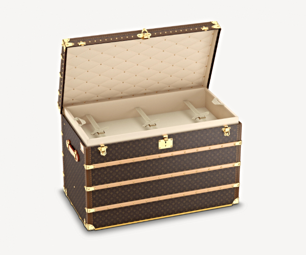 The trunk measures 110 x 69 x 61 cm / 43.3 x 21.7 x 18.9 inches (length x height x width) is made from gaboon wood, poplar wood and beech wood trunk, comes with a quilted cotton lining, Lozine leather trimmings, natural cowhide leather handle and of course the distinctive Louis Vuitton Monogram canvas. £36,000.