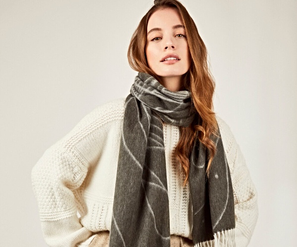 The Zu scarf is a deep charcoal hue crafted in Scotland from an irresistibly soft lambswool and angora blend. The design is inspired by the organic lines found in nature. It is a homage to the sphere. Enchanting in its simplicity, denotes harmony and unity where the beginning and the end exist as one. The Zu scarf is warm, comfortable and perfect in easy to wear luxury fashion.