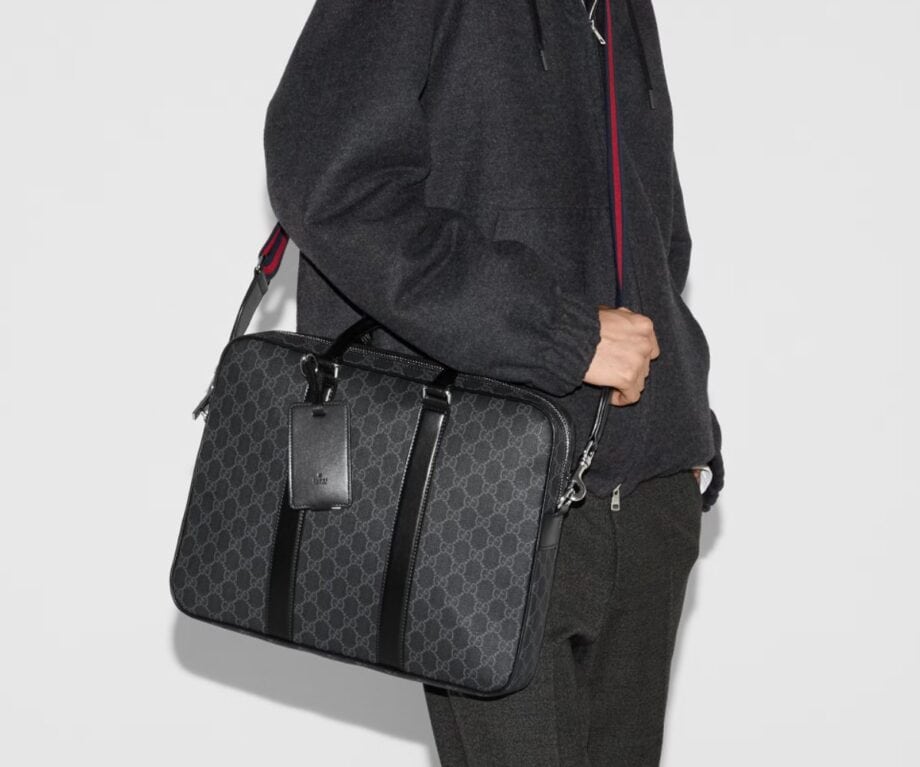 The signature GG Supreme canvas remains an evergreen of the House thanks to its soft and malleable qualities. Crafted from a coated microfiber fabric, here it appears in an all black variation to define this Gucci briefcase. A tonal leather trim completes the style, while a pop of colour appears in the form of the archival Web stripe.
