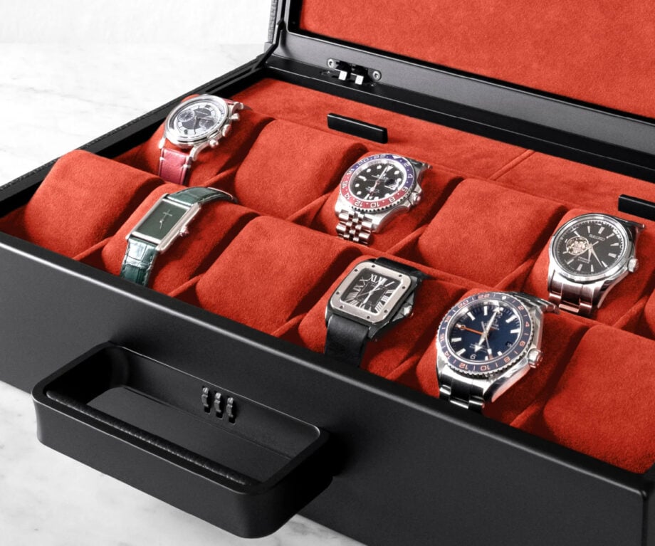 A robust aluminum and carbon fiber frame and a lock with a personalized code keep up to twelve watches safe and secure at home and on the go, while two convenient storage compartments provide extra room for keeping your watch straps, gloves and other accessories.