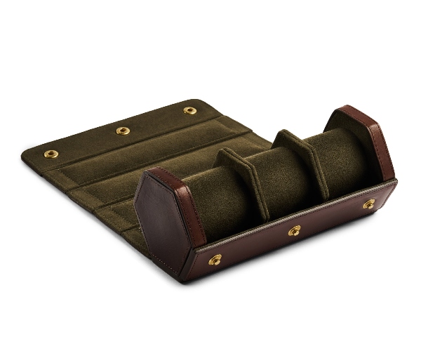 A lot of time goes into these. Every brown leather Bennett Winch Watch Roll is handmade in London by their team of master craftsmen. Tuscan leather panels cut from hand-selected hides are stitched around a flexible Kevlar® core and onto a cushioned Alcantara® suede lining. The resulting structure transforms from a rigid protective shell when closed, into a soft preparation and display surface when open. The future of time travel has arrived.