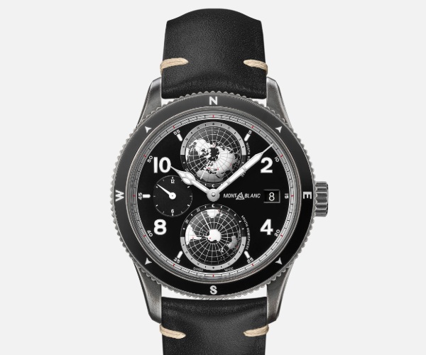 The timepiece features a manufacture world-time complication developed by the Montblanc watchmakers in Villeret: two domed globes, turning in opposite directions, that complete a full rotation in 24 hours. Both are surrounded by a scale with the 24 time zones, along with a day and night indication in contrasting colors. This provides an instinctive way of appreciating the different time zones, aided by luminescent continents for increased visibility and performance at night. The timepiece is completed with a black calf leather strap with beige stitching.