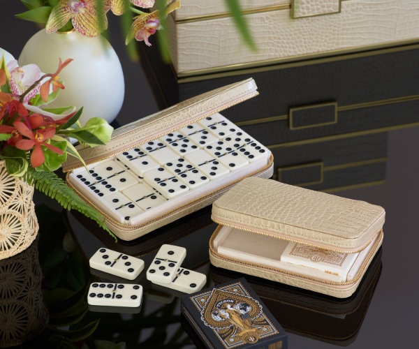 The Enzo Travel Domino Set conveniently holds a set of Double Six dominoes with brass spinners. The case, crafted in Italian Croc Embossed Leather with a zipper, is practical enough to include in a carry-on bag while traveling, but attractive enough to store on a tabletop or a bookshelf at home.