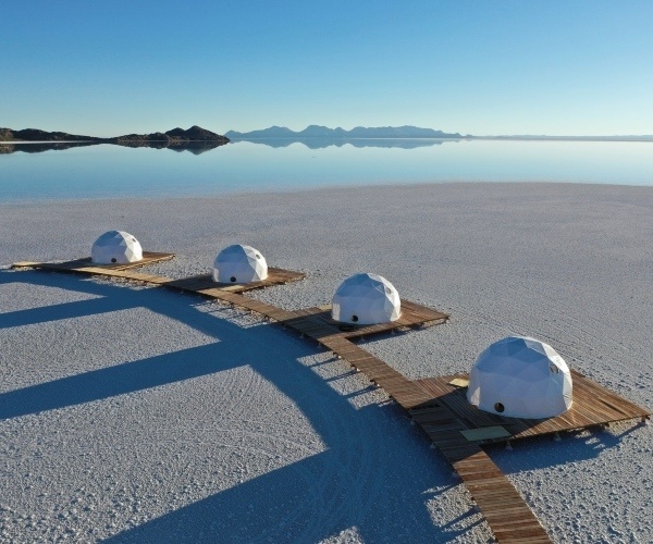 Although Kachi Lodge is a permanent structure, it remains mobile. The whole lodge is built on a wooden platform whose pillars are freestanding on the salt flats. No anchoring or drilling was done in the salt crust. The lodge operates on solar energy, heating the entire water supply. Wind turbines are being evaluated as an additional energy source. For water management, pumps convey the greywater back into a dirty water tank that connects to a unique, reverse osmosis closed-loop filtering system. The system already prevents any discharge of wastewater into the environment and ultimately minimizes water consumption.