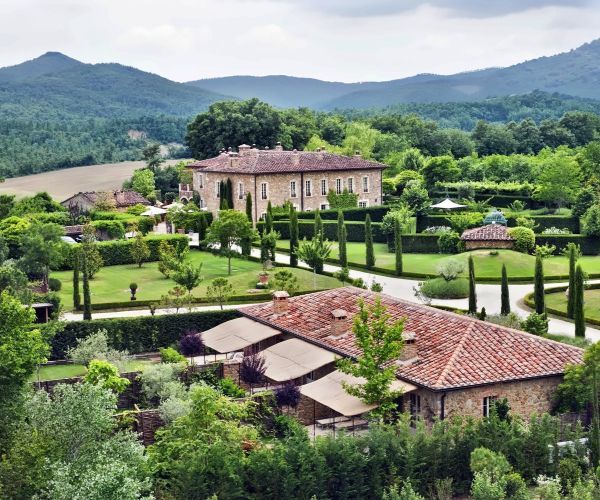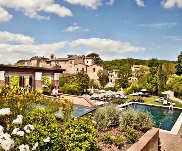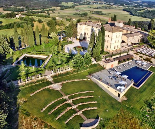 The hotel sits on a vast landholding, 4200 acres. It is in Casole d’Elsa. Besides, the rolling hills of Tuscany surround it. The castle and adjoining buildings contain 39 rooms, including suites. In the surrounding countryside, you will also find farmhouses. These farmhouses are available for rent as villas.