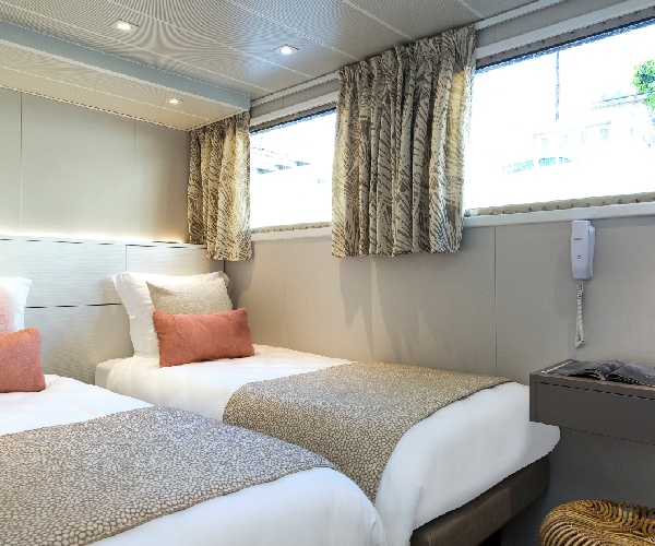 Large windows in a smart and compact cabin give panoramic views of the river and the passing Provençal landscape. Above the two single beds there is a wall-mounted satellite television.