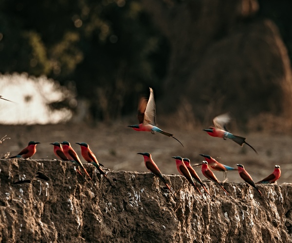 Afternoon came, and we were back on the river. Cruising past islands and sandbanks. Migratory Carmine Bee-eaters, with their vibrant colours and loud chirping calls, swooped overhead and a herd of elephants crossed the wide deep river in front of us, pausing to eat the long grass on one of the islands, before continuing to the bank on the other side.