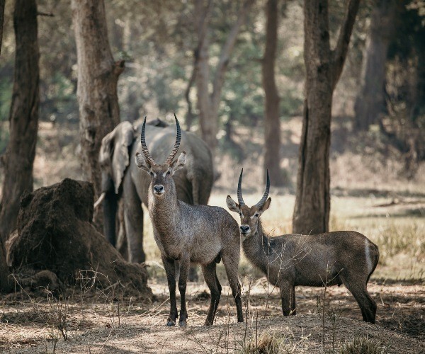 Morning, and we were up early again, but not to fish. This time heading into the park itself for a game drive. The dramatic, brown and green, folds and wrinkles of the magnificent Zambezi escarpment flatten out as they come down towards the river. Against this spectacular mountain backdrop, we head through the Winterthorn forest. The forest was full of waterbuck, males with impressive horns and females with young in tow.