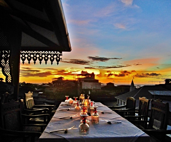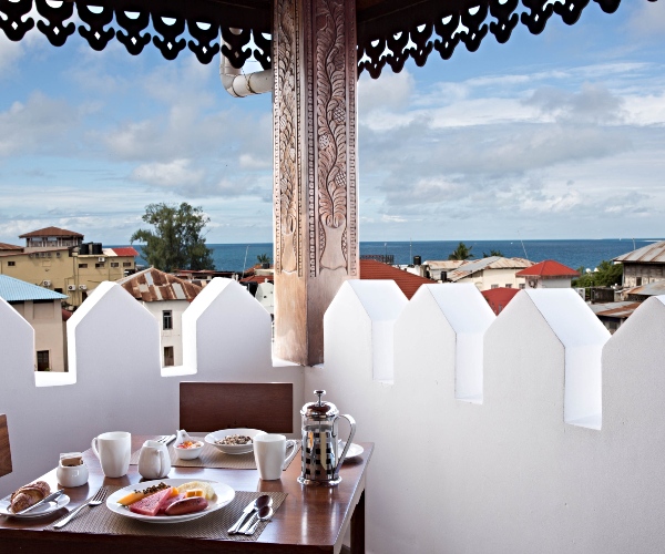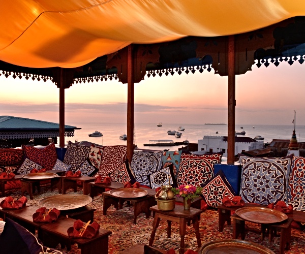 One of the highlights of the hotel is dinner in the Tea House Restaurant on the hotel’s rooftop, with 360° views of Stone Town and across to the ocean. Arrive for cocktails at sunset and dinner starts promptly at 7pm. You can choose whether to remove your shoes and sit on the floor cushions to dine, or you can take your place at a table if you prefer. Dinner is a three course set menu celebrating Zanzibari cuisine; combining the flavours of Swahili, Persian and Omani influences. Dinner is accompanied by traditional music and singing by musicians from the Dhow Countries Music Academy.