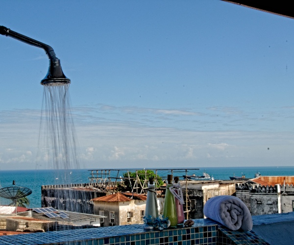 We stayed in the Dunia Suite on the top floor, with its huge Zanzibar bed, so high off the ground that we had to climb into it by stepping on an old wooden trunk, positioned by the bedside for that very purpose! Our bathroom was on an upstairs terrace, with views looking over the rooftops of Stone Town and down to the port.