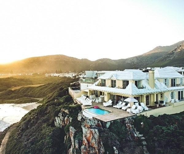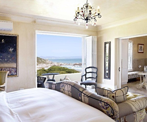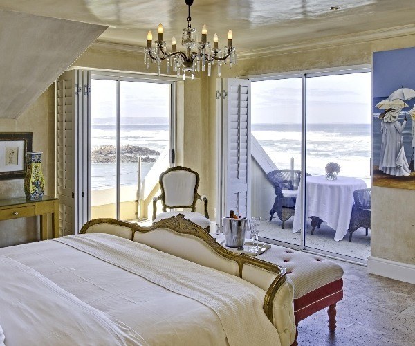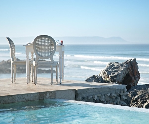 Birkenhead House is a chic beach hotel, and it sets the standard for luxury in Hermanus. With its contemporary décor, quirky opulence and a cliff top position overlooking the ocean, with pounding waves directly below, Birkenhead House is special place and a wonderful getaway. There are only 11 rooms, ensuring personal attention at every turn. The bedrooms themselves are individually and stylishly decorated. There are sea facing bedrooms rooms with private balconies and beautiful views, bedrooms with sweeping mountain views and other rooms, like ours, with their own private plunge pool. The sitting and lounge room has an ornate fireplace, gilt-edged mirrors, opulent furnishings, and views out over the ocean through picture windows. A collection of original artworks and sparkling chandeliers hang throughout the hotel.