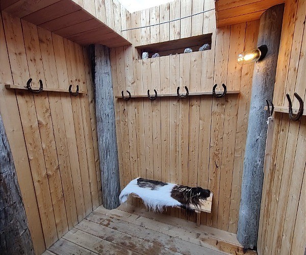 The wooden-clad changing rooms are simply furnished, with bench seating and upturned horseshoes re-purposed as clothes pegs.