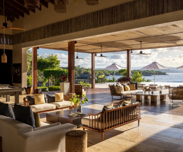 Peacefully perched on a fertile peninsula on the Dominican Republic’s quieter north coast, this ÀNI private resort gives guests exclusive use of two living villas surrounded by 14 vast suites. Hummingbirds hover over lush tropical foliage.