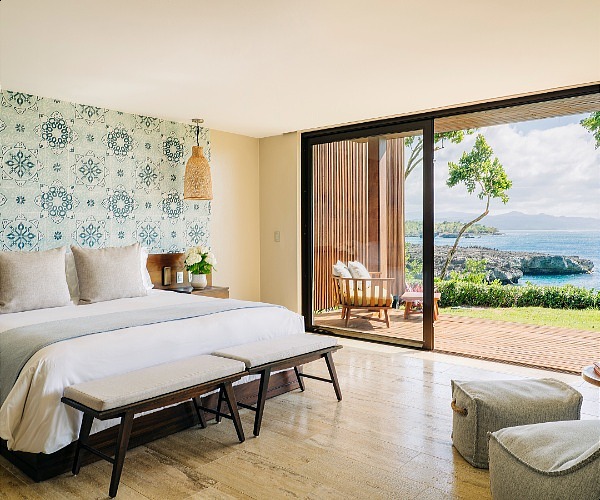 Every secluded room has a full-width Caribbean view leading onto a teak terrace with sun loungers, sunken chairs, and table. A serene spot for listening to waves rhythmically breaking on the rocks below.