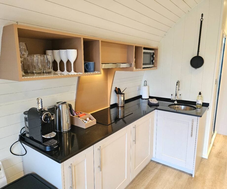 And it doesn’t stop there. There’s a kitchen area that is surprisingly robust, featuring a two-ring electric hob, microwave and even a popcorn pan for late-night movies on the wall-mounted TV, as well as indoor dining space. There are thoughtful touches such as dedicated hot tub ‘glasses’ (more on the hot tub and outdoor space shortly) and a proper coffee machine for that essential morning kick.