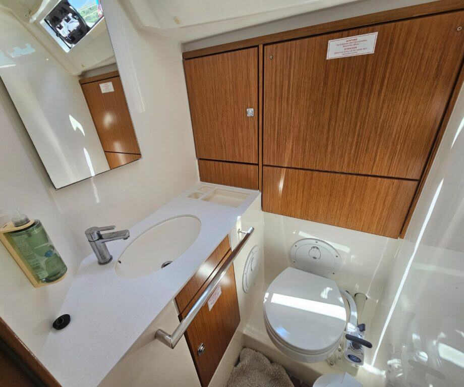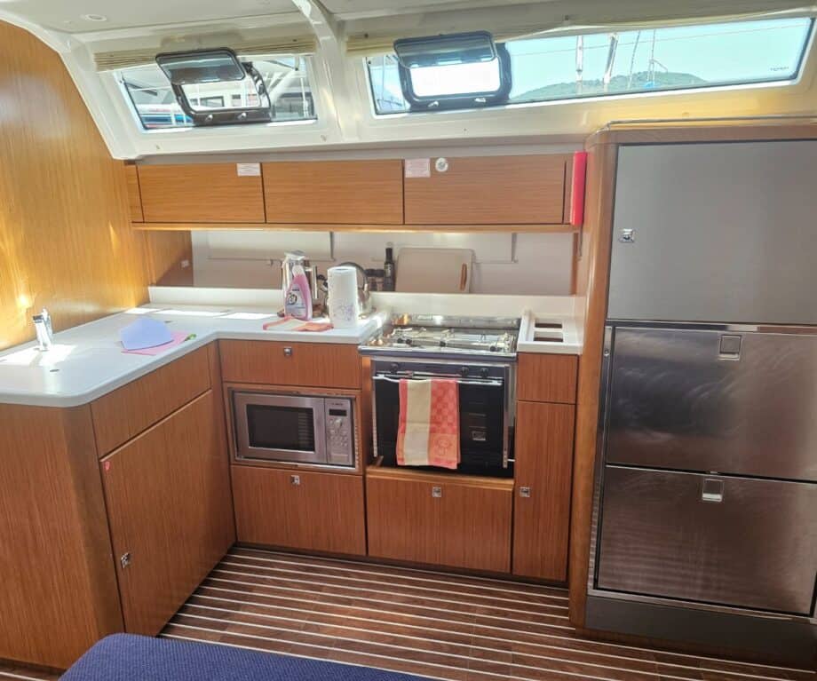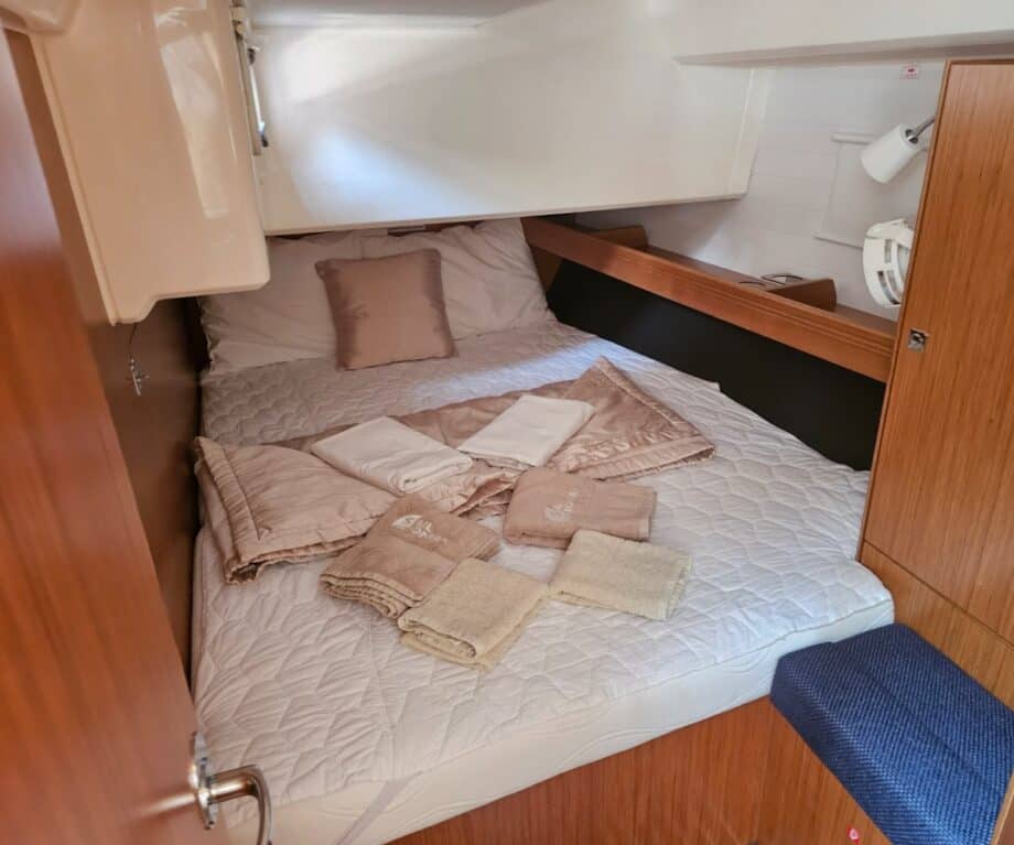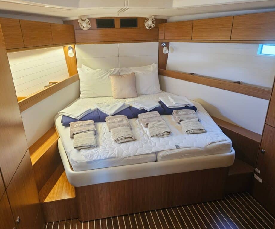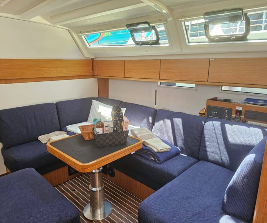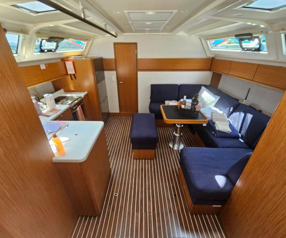 She boasts in-mast furling, a self-tacking genoa, bow thruster, generator, and that rare Aegean luxury — air conditioning. The cockpit was spacious, shaded by a bimini, and the saloon was equally generous.