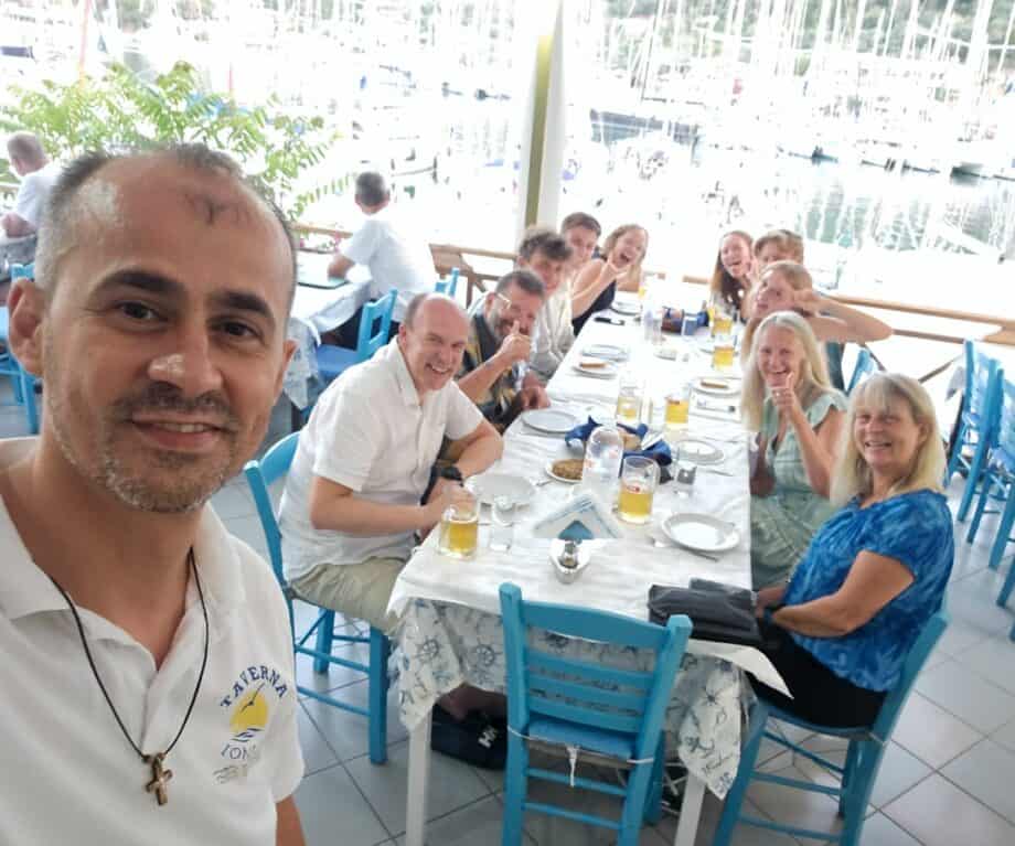 We dropped anchor at Mikros Gialos for a swim and snorkel, before continuing to Sivota, where we moored outside Taverna Ionion. Our waiter there was quite a character and even posed for a selfie with our group, told us a tale or two, and served us the catch of the day — red snapper and dorada, simply grilled, perfectly flaky.