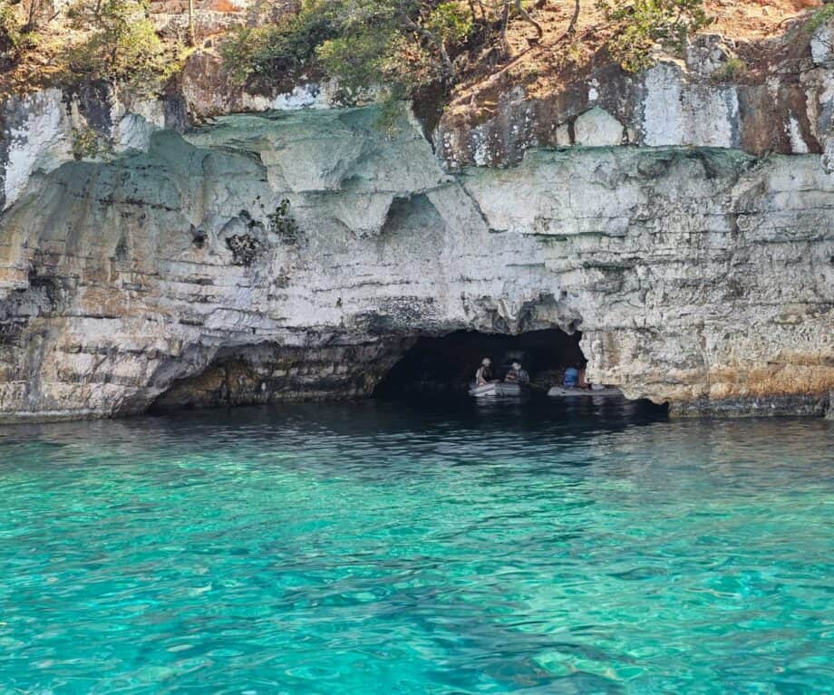 Fiskardo is no secret — a pastel-painted harbour where superyachts jostle with charter boats and the scent of jasmine competes with espresso. We made landfall early to secure a space and took the tender to Foki Beach, where we explored a once-mined limestone cave with tunnels that extend over 100 metres deep.