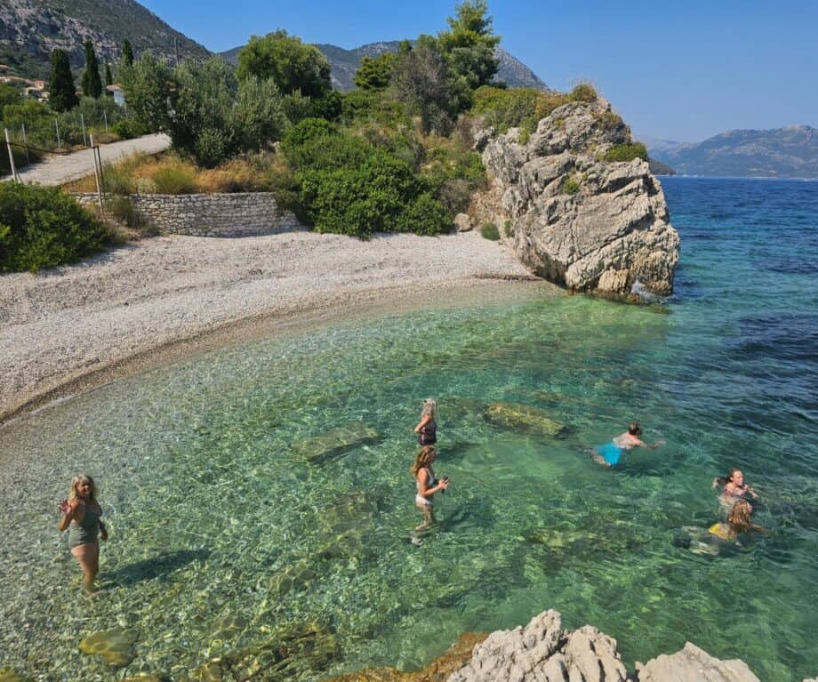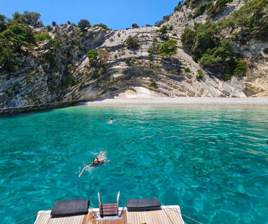 We stopped first at Filiatro Beach — turquoise, crystalline, postcard-perfect — and spent an hour swimming, lounging, and paddleboarding. That night, securely anchored, we skipped the taverna and cooked aboard Te Anau . A dinner with the stars as our ceiling.