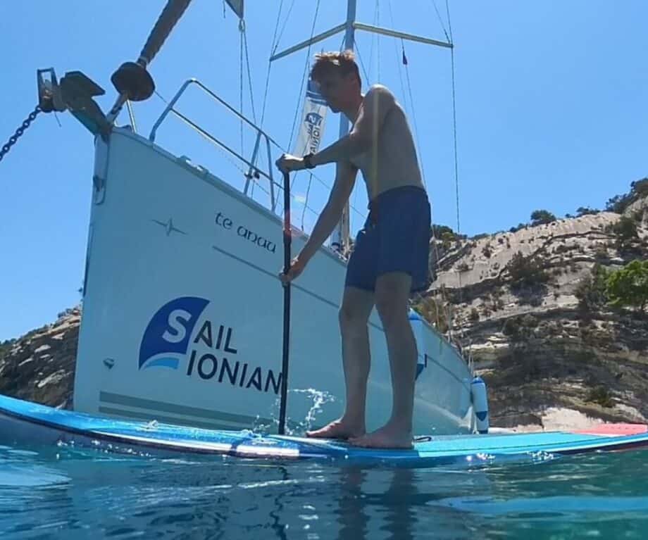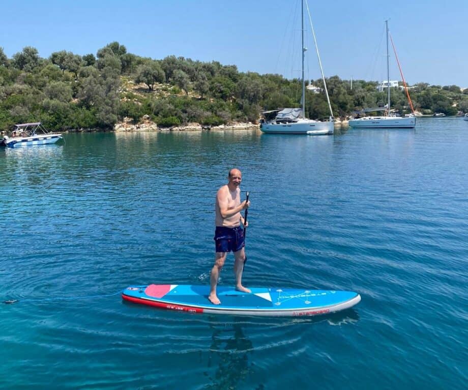 With storms in the forecast and our flotilla return imminent, we decided to head back to Vathy, Meganisi, returning to a familiar bay where we knew the taverna. But before that, we anchored at Pachara Bay, cooled off with a swim and messed around on the paddleboards either side of an on-board lunch.