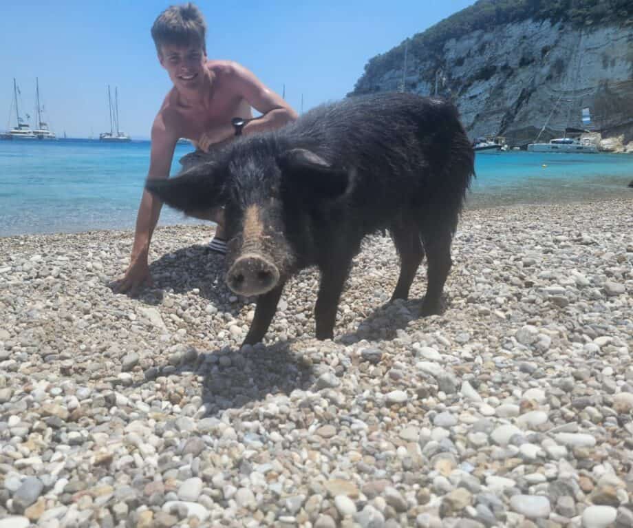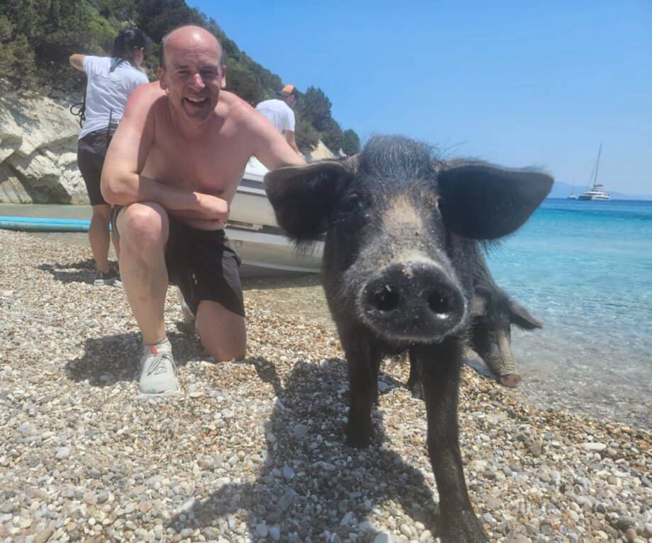 After a morning stroll, we sailed ownard toward Atokos Island, a dramatic hunk of rock with aquamarine waters — and pigs.
