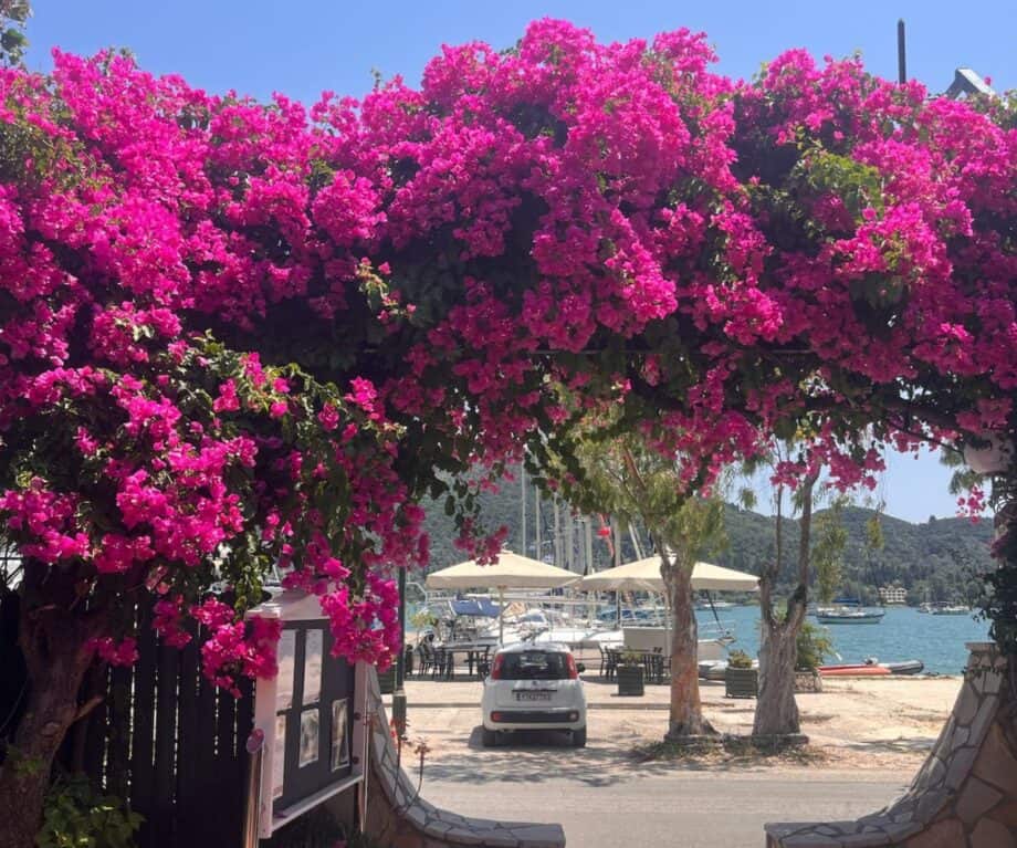 We cut east between Skorpios and Sparti — Skorpios once owned by the Onassis family, now shrouded in billionaire mystery. Our destination: Vathy on Meganisi, where a table awaited us at Karnagio, a beachside taverna draped in bougainvillaea and charm. A few of us paddleboarded after dinner, because… why not? When in Greece…