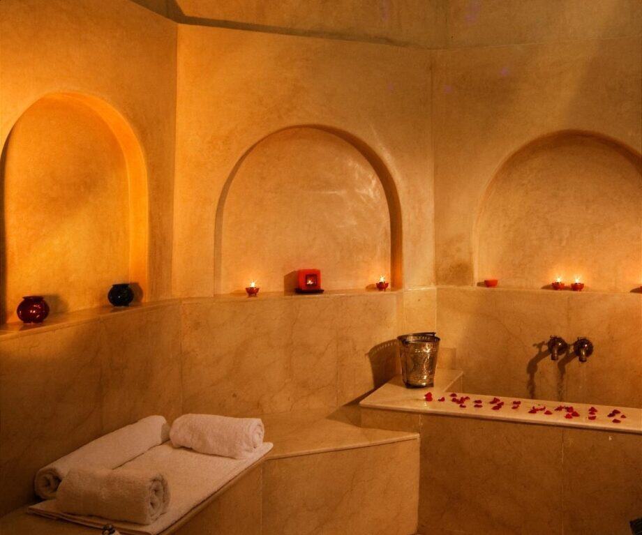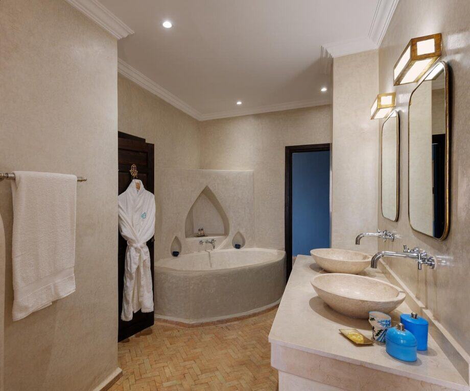 Pure Moroccan indulgence: a deep bath with more mihrab recesses for candles and a superb rainfall shower. A sumptuous bathroom finished in local style with polished tadelakt plaster. And this bathroom has a sea view with a window that looks through the suite.