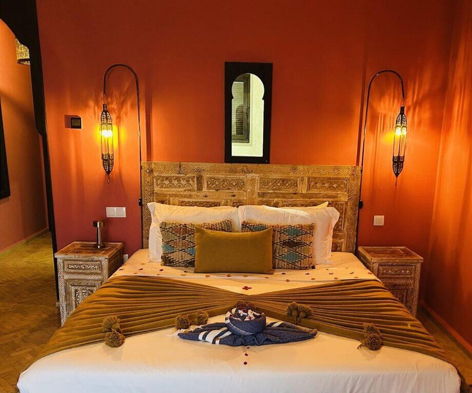 A dark wood marquetry cabinet consumes all our clothes for the week. A sofa, desk and bedside cabinets are lit by brassy Arabian lamps. Mihrab recesses, both aesthetic and functional, host candles. A minibar, plus Netflix and Prime on the television, are reminders that notionally we are still in the 21st century. The large burnt orange rug may have seen action as a flying carpet in a previous life …