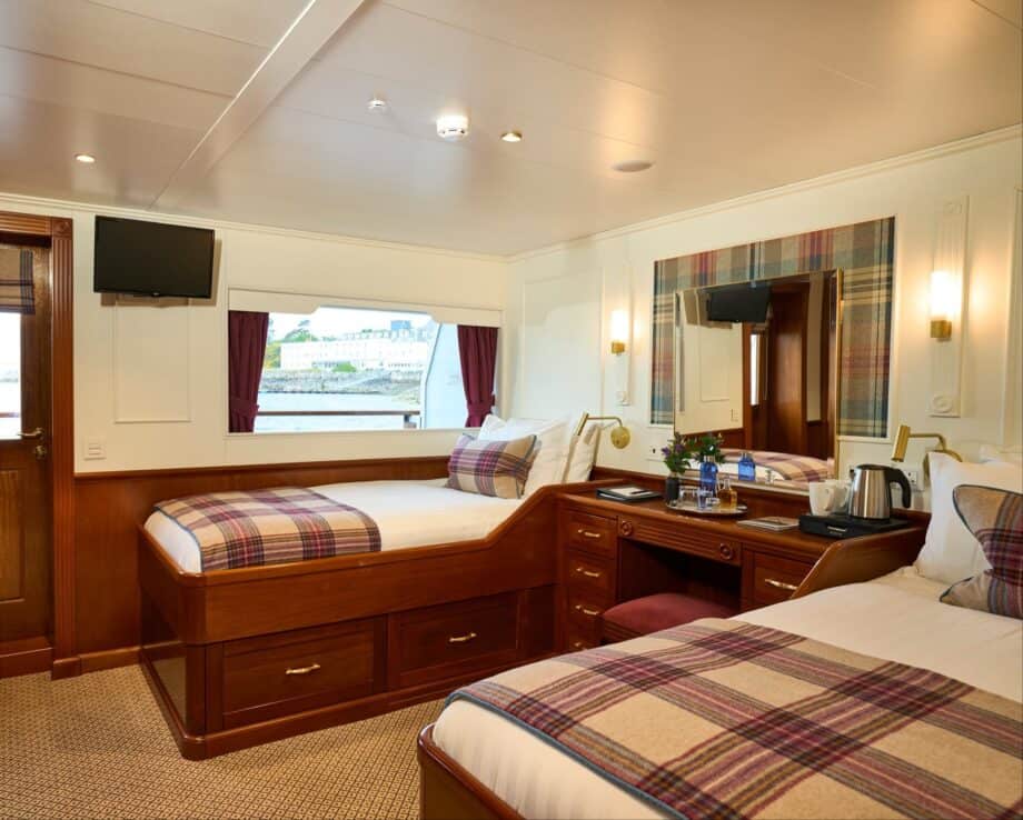 Breakfast, lunch, dinner and drinks are all part of the all-inclusive package which features a variety of 26 single-malt whiskies behind the bar. Stepping ashore, admissions to attractions such as Duart Castle, Mull Cheese Farm, Glenfinnan Monument and the Culloden Visitor Centre are covered, as are tea, coffee and cakes at the cafes.