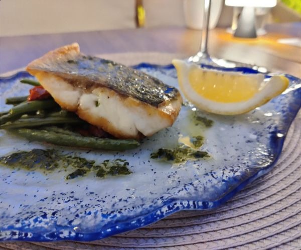 Keeping it healthy, I chose the delightful grilled sea bass with green beans, succulent cherry tomatoes, red pesto and a touch of fragrant basil oil.