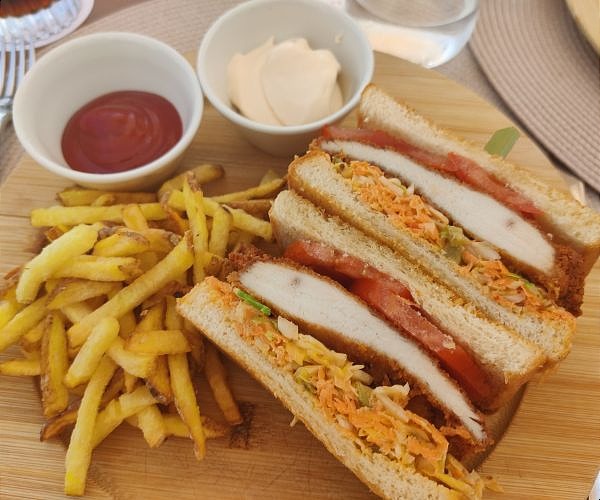 For the perfect lunchtime snack, indulge in the mouthwatering chicken Milano sando-sandwich – a scrumptious creation that combines succulent chicken with the perfect blend of coleslaw, juicy tomato, zesty mustard and crispy French fries.