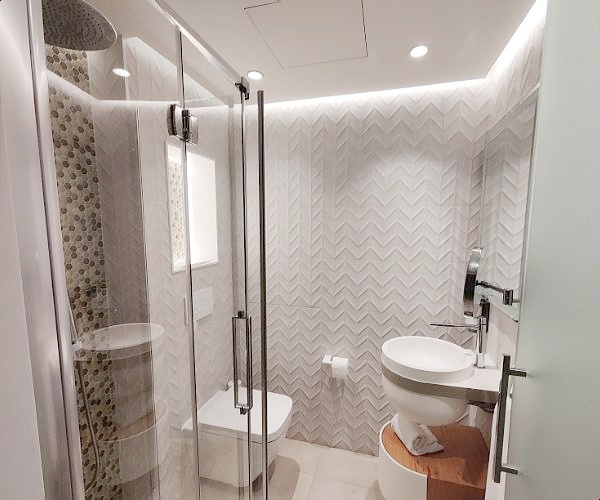 Our apartment included a compact bathroom with rainfall shower, basin and WC. Fluffy towels are provided, and there’s a heated mirror as well as a shaving mirror.