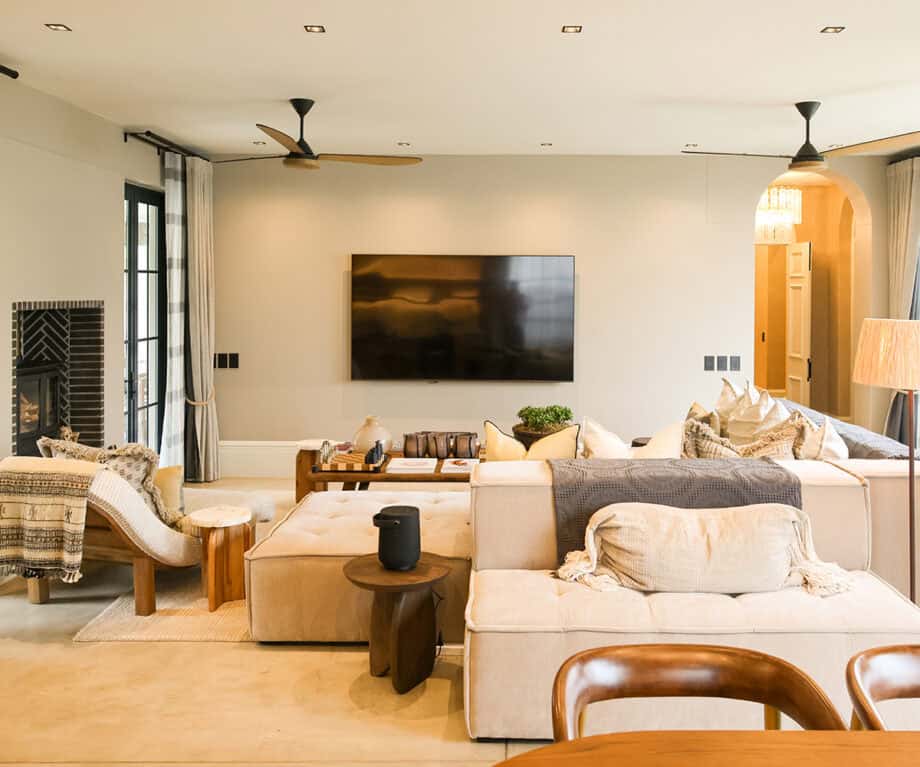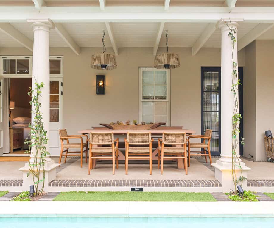 This off-the-grid home has been exceptionally fitted out, with no expense spared. Three plush en suite rooms space themselves off the entrance hall. From the jute flooring, reed-woven wall coverings, to the rattan oak wardrobes, the designers have tastefully brought the outdoors inside. Each of the three bedrooms shares the warmth of the natural materials used, but each has its own personal touch via custom artwork, bed throws, and large scatter cushions. All three bedrooms also open onto the wraparound balcony through French doors, with tables and chairs for outdoor reflection.
