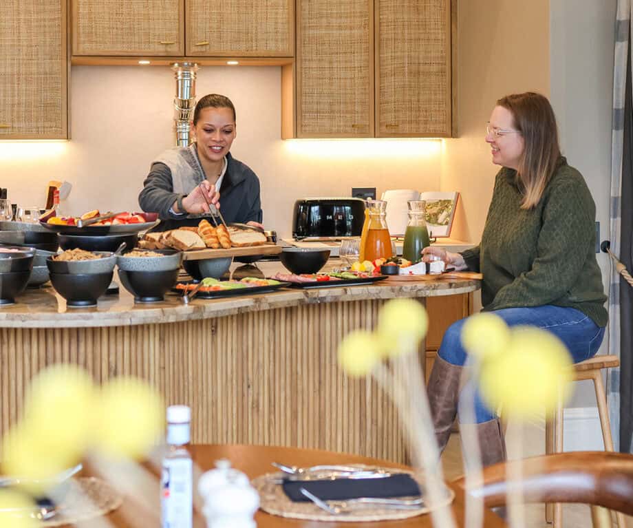 With bags unpacked, it was over to the home’s central living area. An open-plan kitchen/dining/lounge serves as the communal space for social connection. Here, attention to design details continues, from the warm timber tones and matt brass details on the chairs to the beautifully chamfered design on the table legs. A clever flow of natural materials, with all the flooring transitioning seamlessly.