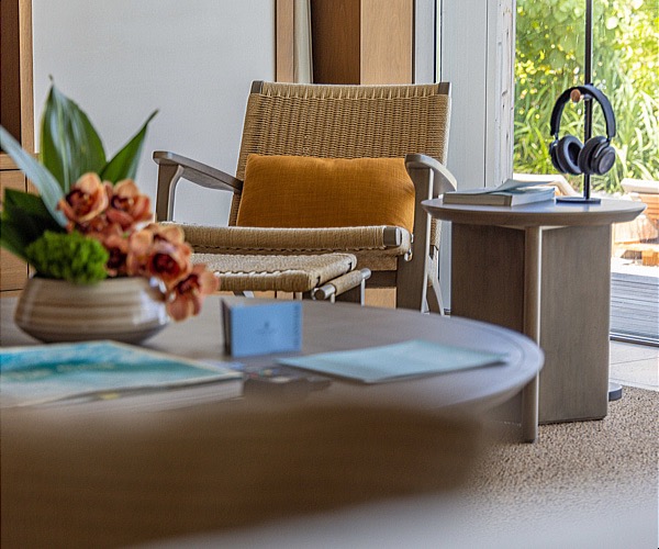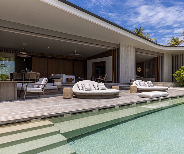 I loved the straight forward design where you walk into the massive living area where the views and light from outside instantly grasp your attention. A giant dining table invites you to have in-room family dinners while the salon provides you with endless seating to hang around in the evenings when the kids are in bed and you just want to escape from it all by putting on those B&O headphones and listen to Joni Mitchell. The floor to ceiling windows that can be found throughout the villa slide open and vanish into the walls, creating a massive tropical canvas on which your eyes feast from the moment you wake up.