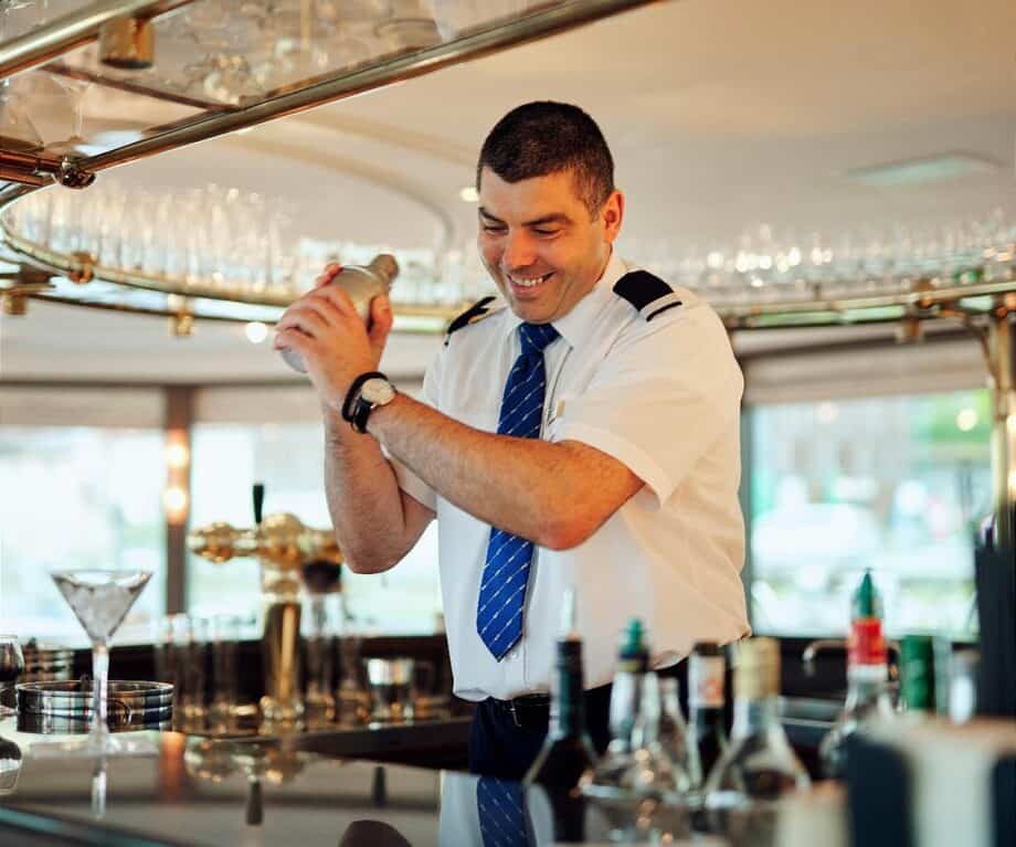 Back on board, during the cocktail hour, Pierre and his partner Nicole, give a dancing demonstration. Whilst Nicole rapidly changes dresses and eras between dances, Pierre, who has danced at Blackpool, gives hilarious commentary on the differences between British ballroom and more relaxed French dancing.
