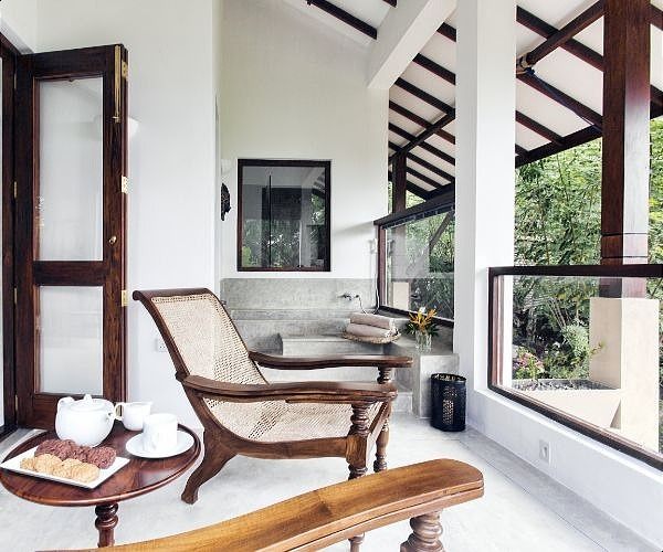 Clove plants, wrapped with pepper creeper, and tea trees appropriately line the path to the Tea suite. Jack tree wood, easily mistaken for the rich deep tones of mahogany, frames the large windows and doors.