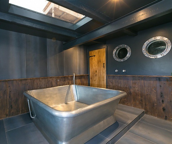 Stairs lead down to a contender for St Ives’ largest bathroom. Picking up on traditional Cornish textures, a William Holland Alvius tin spa bath is big enough for at least two. Above the slate floor there are two side-by-side showers and also another heated shower cubicle ideal for drying wet-suits. A cupboard is home to a washing machine.