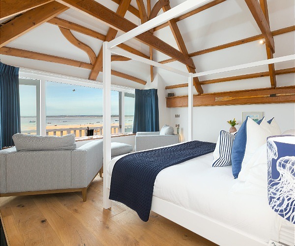 The third floor houses the bedroom, with contemporary four poster bed, and stunning views overlooking the harbour. A bedside remote control opens the curtains. Two arm chairs are even closer to the sea view.