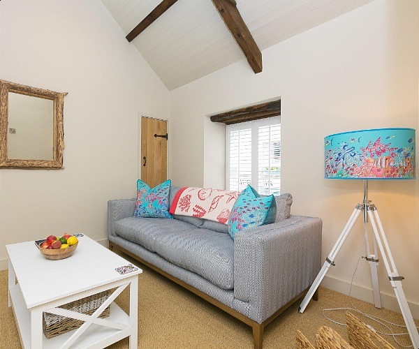 More stairs lead up to a cosy snug, sofa facing the television, and the loo too. Throughout the coastal colour palette is largely natural and neutral