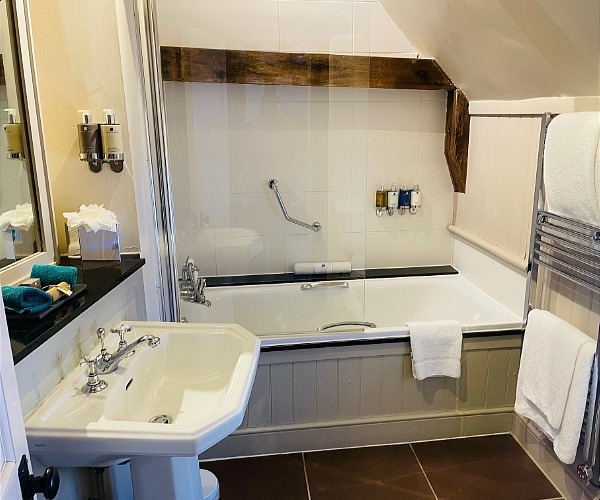In a historic bowing building that rarely does straight lines, the bathroom has a leaning wall too. Yet, that does not stop this white-tiled, dark-beamed haven of cleanliness from providing ample shelving.