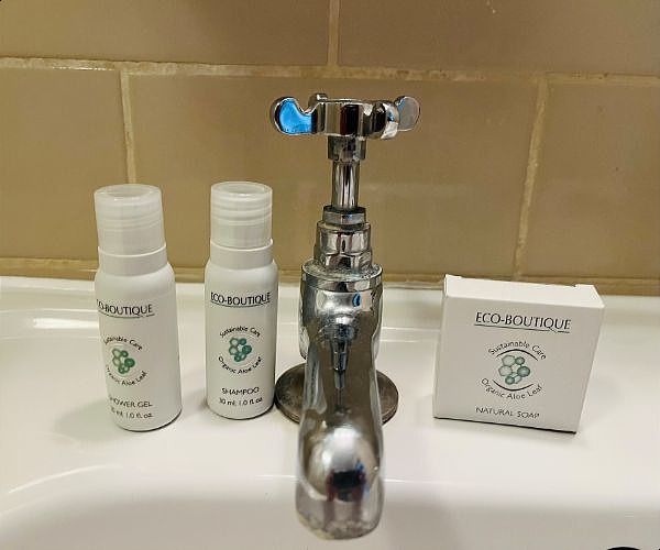 For more 21st century cleansing tastes there is also a shower. Sustainable aloe leaf toiletries are by Eco-Boutique.