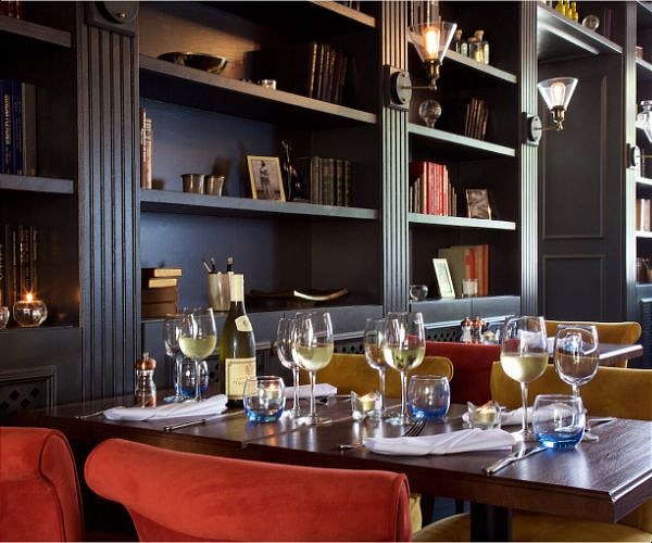 The restaurant slides from book-lined, exposed brick, copper-ceilinged historic to a contemporary bright conservatory overlooking the garden. Softly furnished chairs – aubergine, mustard, sage, and russet – wait at light wooden tables.