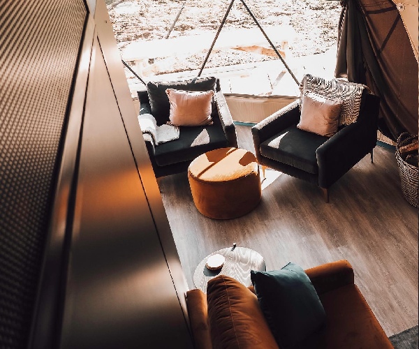 Although this is an idyllic rural location there is a stylish penthouse feel to the domes. Light grey wooden flooring and the dome’s cream interior contrast with sleek black furniture. A tan sofa and a huge smart television add decadent tones. Two tan pouffes remind us that this this is the time and place for literally putting your feet up.