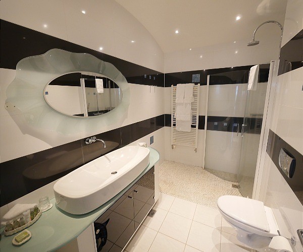 The theme continues in the bathroom, designed to look like a little hut in the Antarctic, where the walls are adorned with black and white tiles; there’s a spacious walk-in shower, a wide basin with a large oval mirror surrounded by frosted glass above it, and LED downlights that resemble stars.
