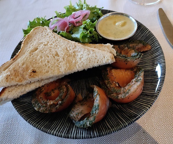 Pescatarians will enjoy the cured salmon (graflax) with toasted bread, salad and dill sauce.