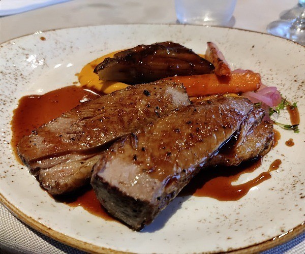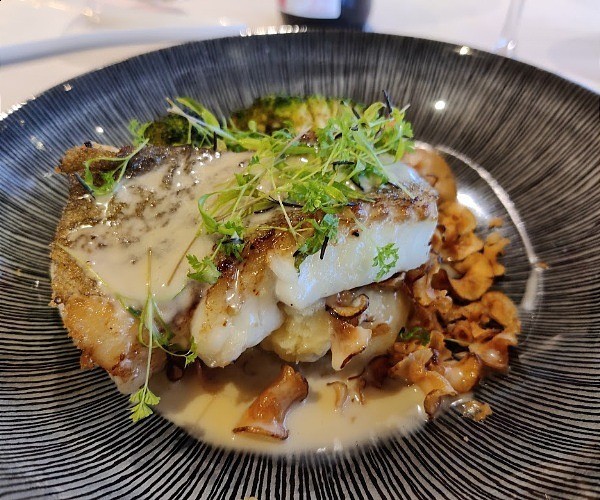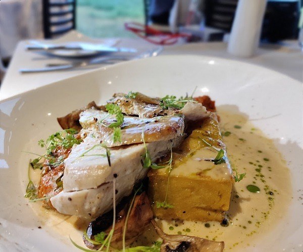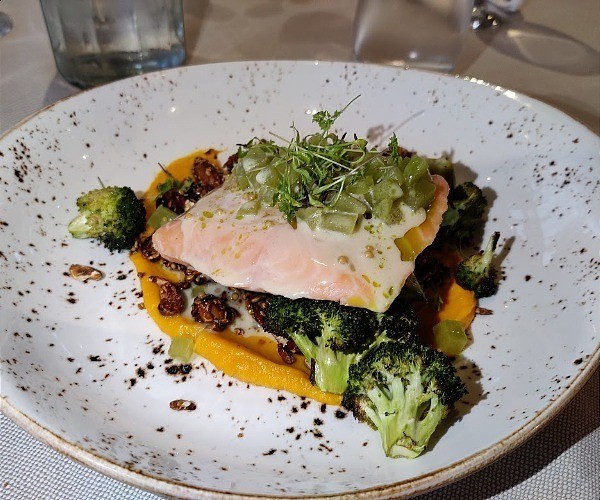 Since the restaurant overlooks one of Iceland’s finest salmon rivers, it is a shame not to try the salmon (lax) with sweet potato purée, apples, mustard seeds, fried broccoli, granola and white wine sauce.