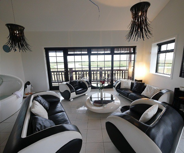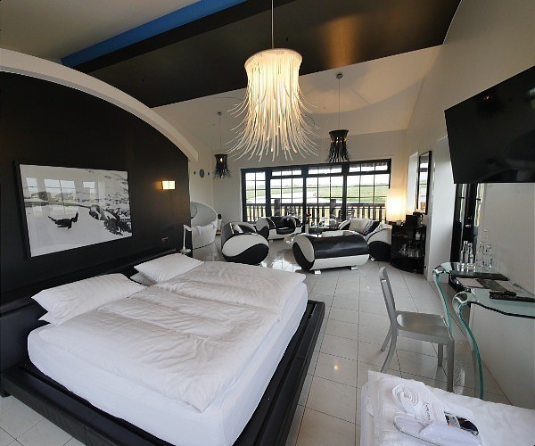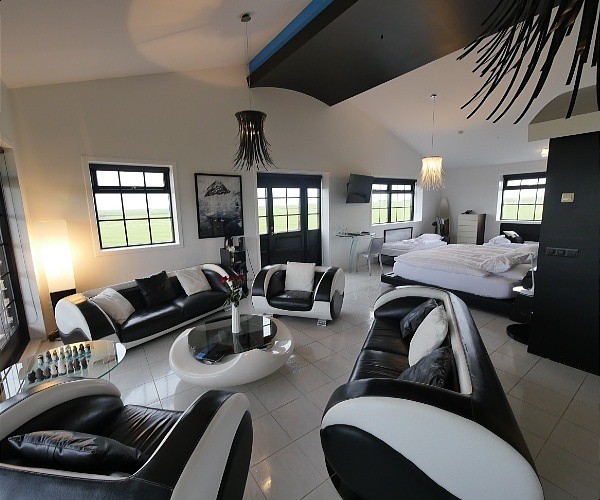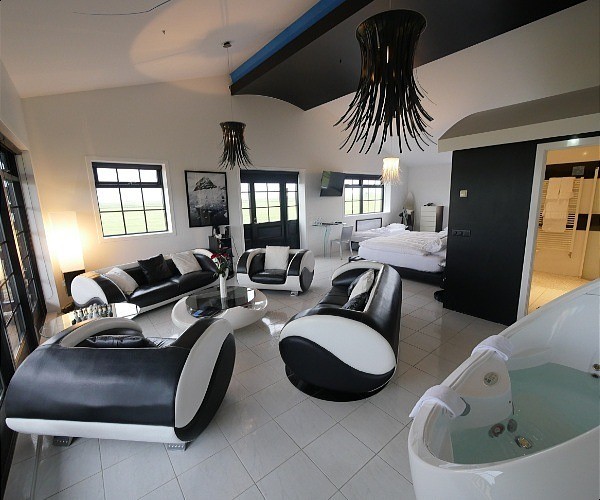 Futuristic black and white décor, alternating black and white lamps and light fixtures, and floor-to-ceiling windows with black-out blinds complete the look.